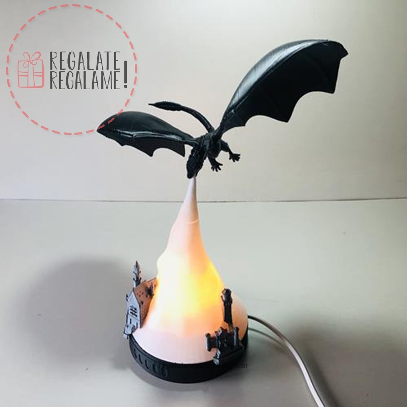 Excelente lampara velador del dragón que siempre esperamos en game of thrones! Luz dentro del fuego que incendia la ciudad. Altura total de 35cm, ancho del dragón de 28cm, base circular de 15cm. Se entrega completo todo armado listo para decorar tu lugar.