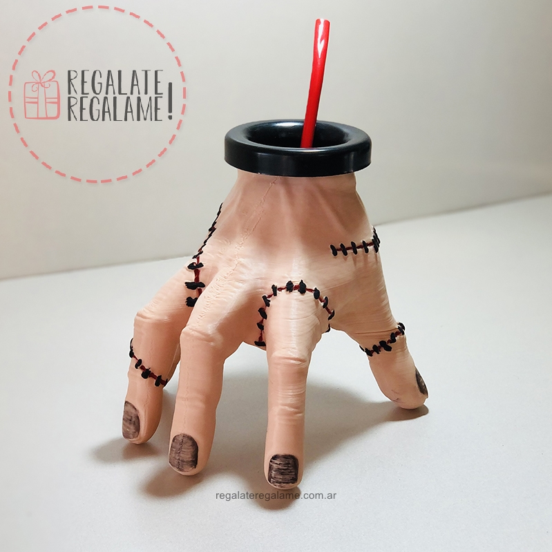 Llego el mate de dedos!! hola realizada a partir de esta singular mano, el genial personaje de la serie merlina o de los locos adams. Altura de 20cm, realizada en impresión 3d y pintada a mano. Se entrega con bombilla.