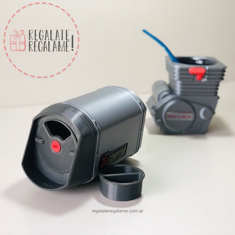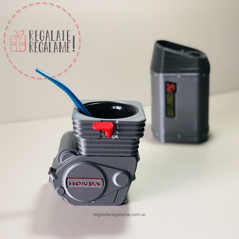 Set de mate con yerbera o azucarera de escape Akrapovic, podes usarlo como yerbera o azucarera, tiene tapa a tosca en la base altura de 15cm por 9cm de ancho. El mate con forma de motor se le pueden poner logos de otras marcas!! Excelente set.