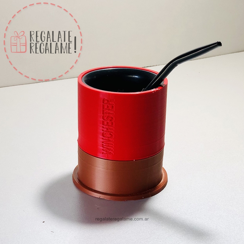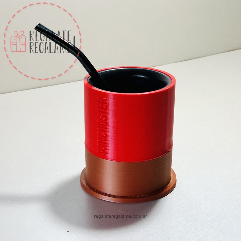 Mate de cartucho winchester, con polimero para mate y bombilla. Altura de 11cm y diámetro de 9cm.