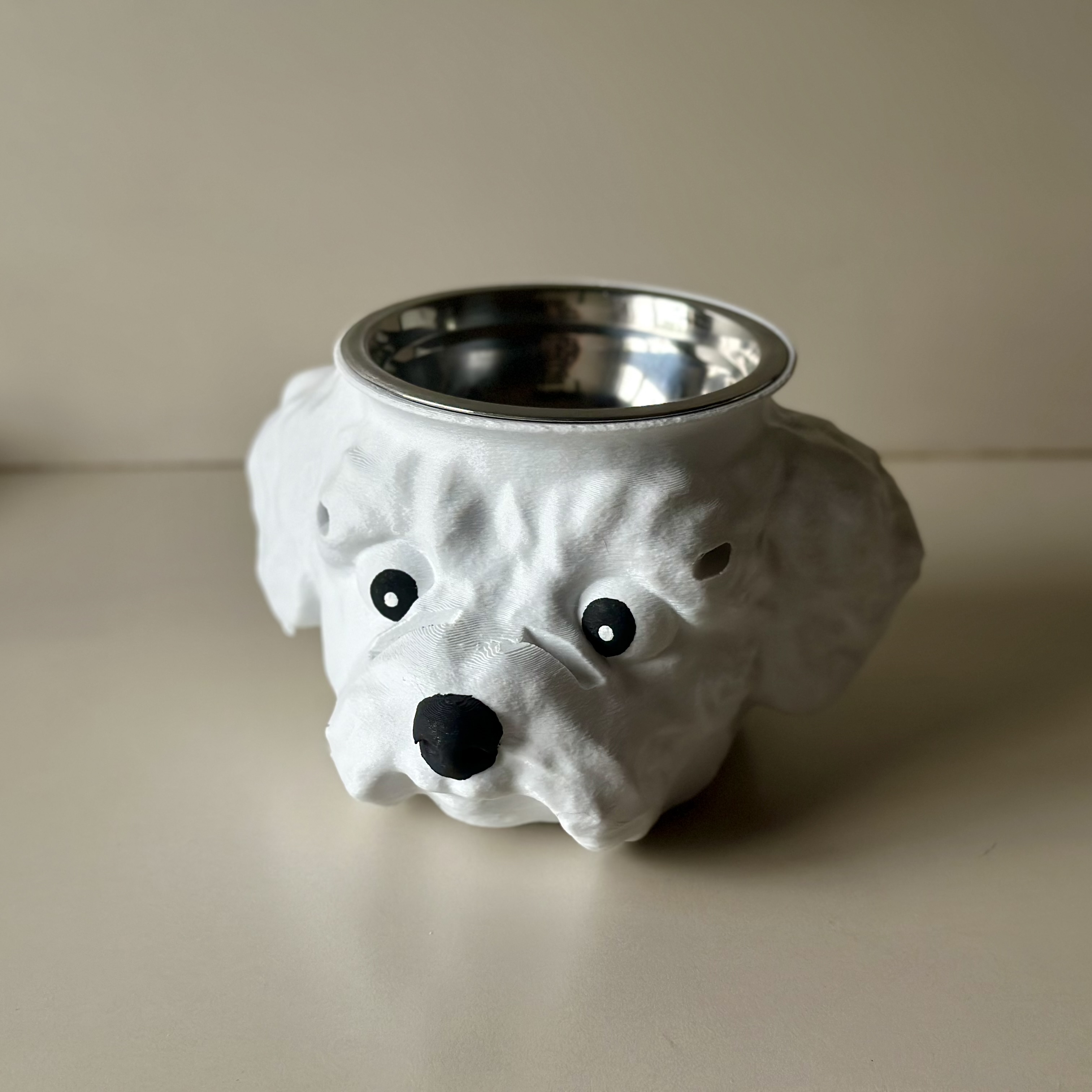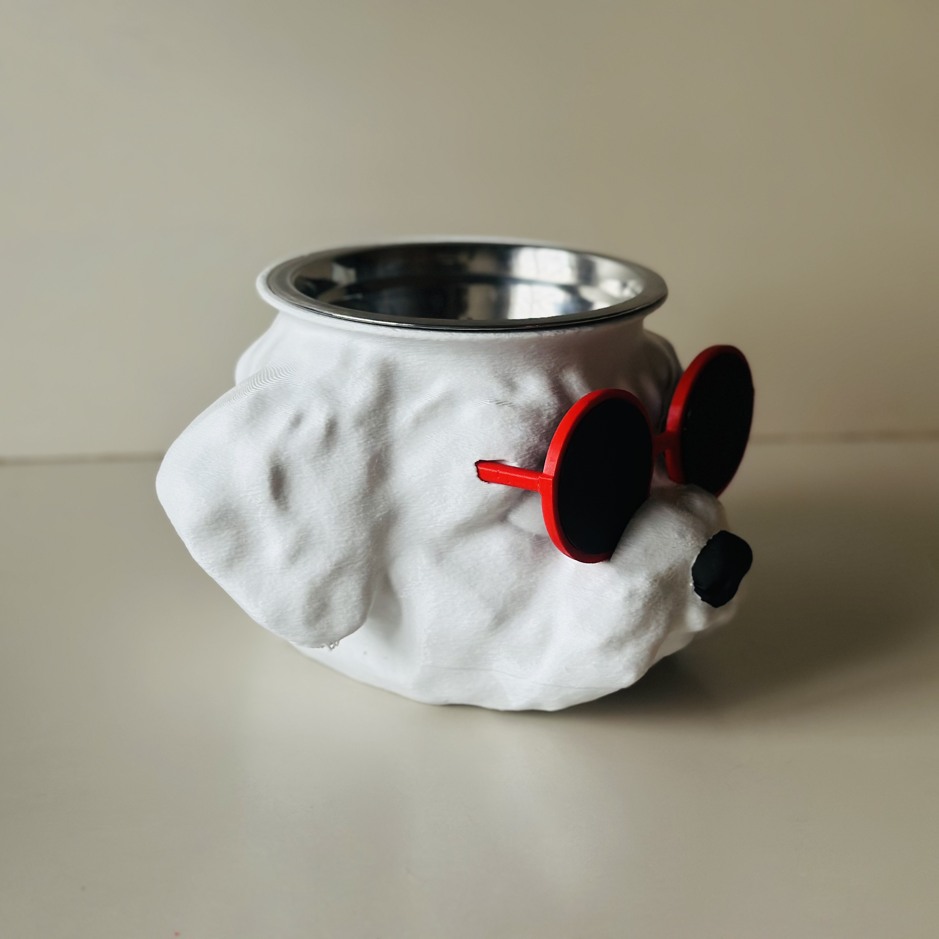 Hermoso comedero cabeza de caniche, con unas simpaticas gafas de sol, podes encargarlo en la combinación de colores que mas te guste. El comedero superior, el bowl con una medida de 13cm de diámetro y 5 de altura, es desmontable para que puedas sacarlo cuando necesites. La altura completa de la pieza es de 13cm.