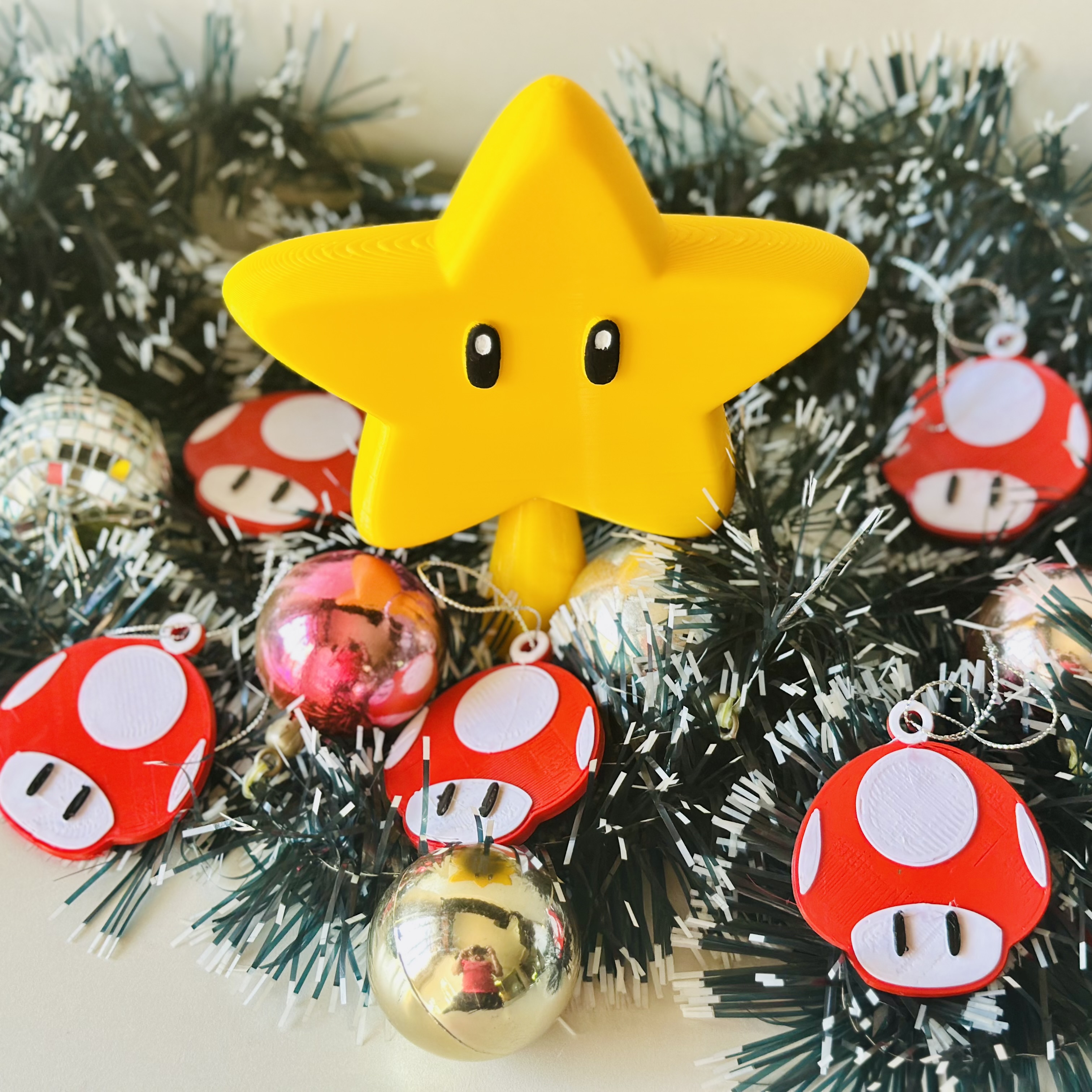 Set de 6 adornos de Mario Bros, incluye la estrella con una altura total de 18cm, ancho de 15cm. Los adornos colgantes son 5 Honguitos que pueden ser en otros colores, medida de 6cm de ancho por 7cm de alto.